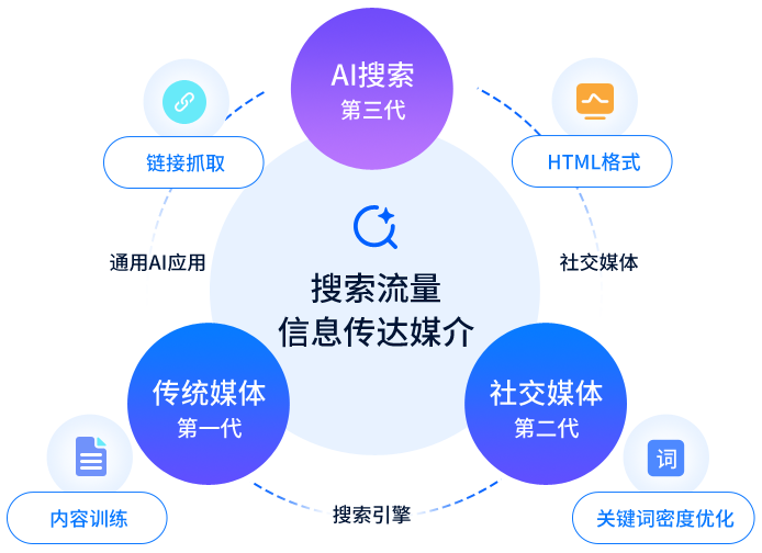 聚焦于传统搜索引擎(如Google、百度、抖音、小红书等)的网页、社媒搜索的结果排名,通过关键词优化、内容价值性、外链建设等技术提升网页点击率。